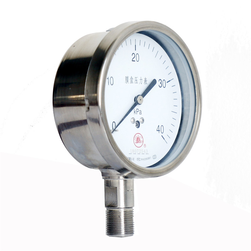 不銹鋼膜盒壓力表采用不銹鋼波紋膜盒作為測量微小壓力的敏感元件。不銹鋼膜盒壓力表適用于測量對不銹鋼不起腐蝕作用,無爆炸危險的氣體或液體的微小壓力。表盤上面有調(diào)零裝置,可以方便調(diào)整零位。不銹鋼膜盒壓力表廣泛應用于石油、化工、冶金等工業(yè)部門壓力測量,不銹鋼膜盒壓力表可以就地安裝并現(xiàn)場指示壓力。本公司可根據(jù)用戶需要,設(shè)計、制造特殊用途的不銹鋼膜盒壓力表產(chǎn)品,歡迎來人來電、來函洽談!